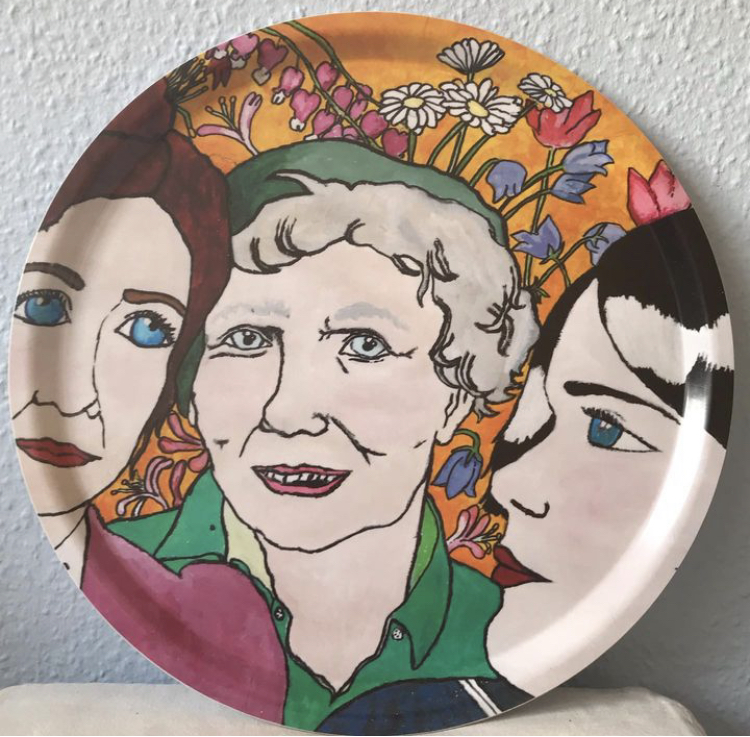 A breakfast tray with portraits of Hilma Af Klint, Astrid Lindgren and Karin Boye